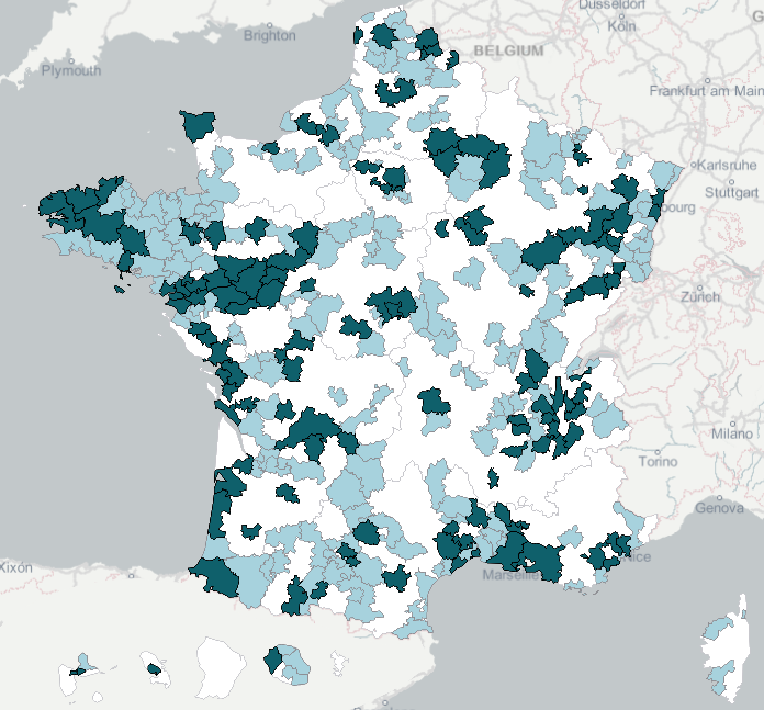 Conformément à la loi, les conseils de développement sont obligatoires dans toutes les intercommunalités de plus de 50 000 habitants et dans les PETR. Pour autant, nous n’avons pas repéré de conseil de développement pour 74 EPCI (Etablissements publics de coopération intercommunale) et pour 37 PETR (Pôles d’équilibre territoriaux et ruraux) comme en atteste la carte suivante.