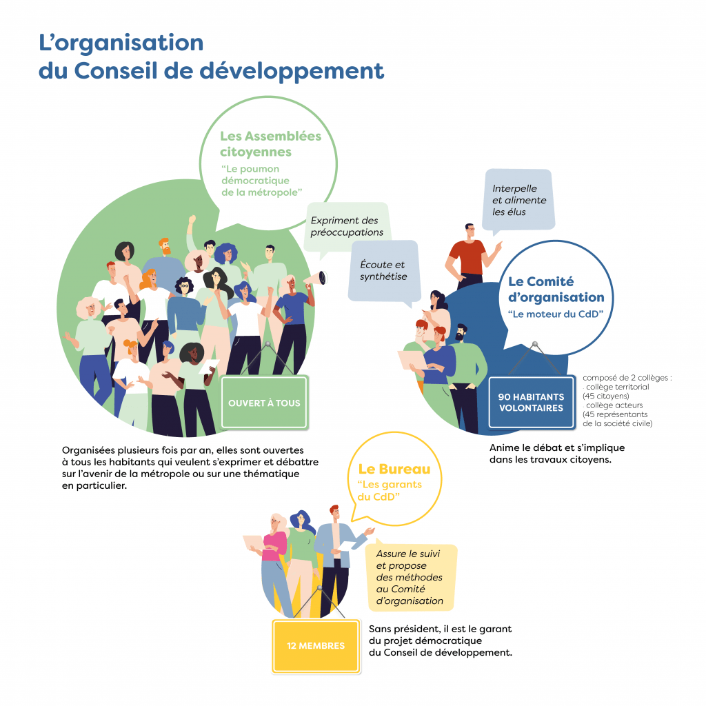 Le Conseil de développement repose sur 3 piliers (les assemblées citoyennes, le comité d’organisation et le bureau) pour une organisation simple et un mode de gouvernance horizontal, démocratique et transparent.